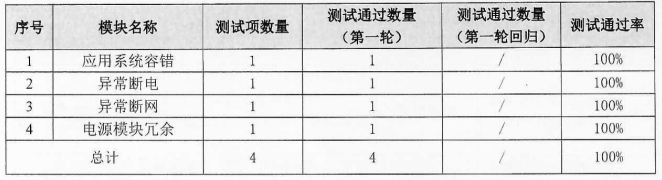 可靠性方面:測試范圍包括應(yīng)用系統(tǒng)容錯、異常斷電、異常斷網(wǎng)、電源模塊冗余共4個模塊,執(zhí)行四條用例,全部通過。