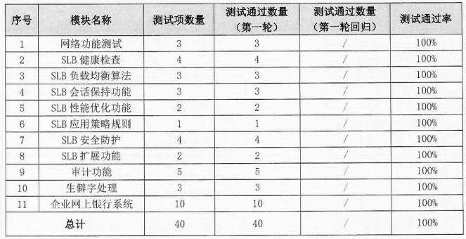 功能性方面:測試范圍包括網(wǎng)絡(luò)功能測試、SLB健康檢查、SLB負載均衡算法、SLB會話保持功能、SLB安全防護、SLB擴展測試等11個模塊,共計執(zhí)行40條用例,均通過測試。