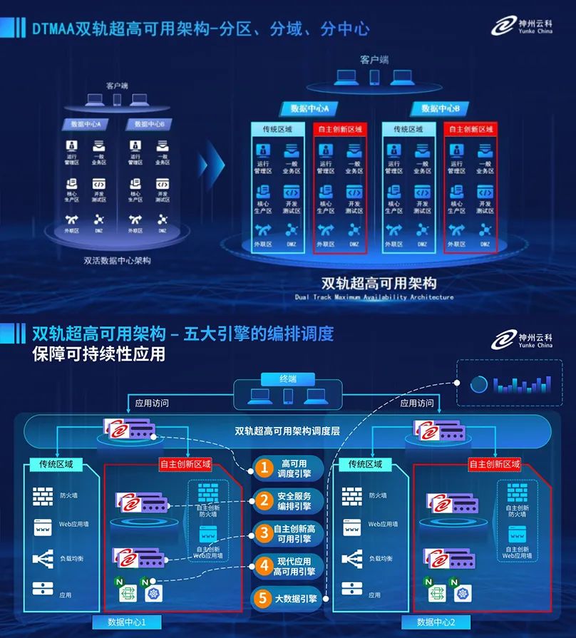 為助力銀行業(yè)務(wù)高質(zhì)量發(fā)展,更好地應(yīng)對(duì)數(shù)字經(jīng)濟(jì)時(shí)代對(duì)可持續(xù)性的高要求,實(shí)現(xiàn)“信創(chuàng)”與“數(shù)字化”齊頭并進(jìn),leyu.樂魚創(chuàng)新性的推出了雙軌超高可用架構(gòu)。該架構(gòu)在雙活數(shù)據(jù)中心的分區(qū)調(diào)度基礎(chǔ)上,增加信創(chuàng)域和非信創(chuàng)域的分域調(diào)度,實(shí)行信創(chuàng)域與傳統(tǒng)域應(yīng)用全量部署,使雙中心運(yùn)營變?yōu)殡p中心四區(qū)域并行運(yùn)行,互為多活,將“0到1”的單軌建設(shè)道路變?yōu)榉謪^(qū)分域協(xié)同的多活雙軌超高可用架構(gòu)。幫助客戶在新架構(gòu)下,保障“信創(chuàng)”的同時(shí)解決性能瓶頸,提升穩(wěn)定性,保證應(yīng)用可持續(xù)性,最終實(shí)現(xiàn)信創(chuàng)區(qū)域和非信創(chuàng)區(qū)域的平滑過渡,完成國產(chǎn)化替代目標(biāo)。