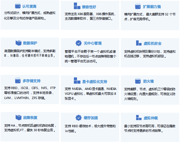 虛擬化場景融合計(jì)算和存儲資源,提供具有極簡 、高效 、可靠的虛擬化環(huán)境 。提供 OS 一鍵式交互安裝,支持業(yè)務(wù)的快速上線,靈活擴(kuò)展 。對各類資源統(tǒng)一管理,按需分配,支持一鍵巡檢 、歷史性能數(shù)據(jù)統(tǒng)一監(jiān)控 。支持第三方虛擬化管理平臺 、CDP 保護(hù)平臺 。支持?jǐn)?shù)據(jù)多副本及 EC 技術(shù) ,大幅提升用戶可得容量 。提供多種安全可靠策略 ,HA 高可用 、備份計(jì)劃,虛擬機(jī)保護(hù),保障業(yè)務(wù)連續(xù) 。